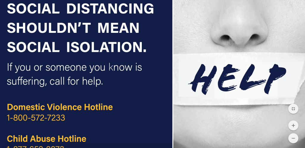 Public awareness campaigns: Some jurisdictions have instituted publicity campaigns encouraging members of the community to report child abuse and neglect. For example, the New Jersey Department of Children and Families launched a ‘Social Distancing Shouldn’t Mean Social Isolation’ campaign to raise awareness about child abuse, domestic violence and other dangers facing residents while homebound. It include a flyer about warning signs of child abuse as well as a more general resource that includes telephone numbers for the child abuse, domestic violence, mental health, and other hotlines. In a Call to Action for State Governors, CHILD USA, a national think tank focused on child protection, suggests that Governors should add to all their COVID updates a reference to the need for all adults to be alert for signs of abuse and neglect, along with how to reach the child abuse hotline.