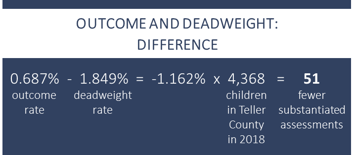 Using data provided by the state on its online dashboard, the OMNI researchers found that there were 82 substantiated assessments in 2015 and only 30 in 2018. To adjust for population changes they divided each number by the number of children in the County at the time, producing what they called an “outcome weight” for 2015 and a “deadweight rate” for 2018, as described in the first graphic below. Subtracting the deadweight rate from the outcome weight and multiplying by the child population in 2018, the researchers came up with a reduction of 51 fewer substantiated assessments in 2018, as illustrated in the second graphic. (The adjustment made little difference; simply subtracting the 30 from 82 resulted in a reduction of 52 substantiated assessments.) This impressive drop in substantiated cases translates to a “62.84 percent reduction in substantiated assessments from 2015 to 2018.”