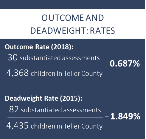 Finally, the researchers calculated a return on investment using total child welfare expenditures in 2018 divided by the number of substantiated assessments in that year, resulting in a total cost of $49,026 per substantiated investment. Multiplying that figure by 51, they concluded that the reduction of 51 substantiated assessments, (of which 100 percent were attributed to the program) saved the Teller County child welfare system $2,500,326 in 2018 compared to 2015. Dividing this total by $856,194, they came up with a “Return on Investment” of $2.92 for every dollar spent on the program.