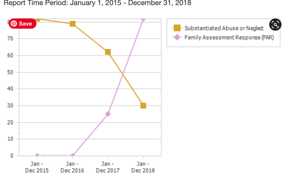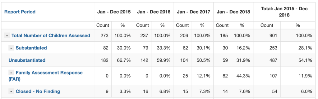 If there was any doubt that the advent of Differential Response may be related to the drop in substantiated assessments, one only has to look at Figure One below. It is hard to figure out how the researchers missed this graphic, which is prominently displayed on the relevant page of the data dashboard, and shows how substantiations fell between 2016 and 2018 as the number of children assessed through FAR increased. This is a bizarre error, considering that the researchers specifically cited the prior rollout of differential response as a reason for choosing 2015 as the baseline year for the study.