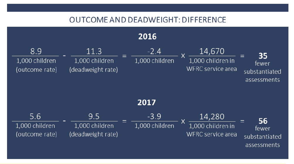 Using data from the pre-existing evaluation, the researchers subtracted the substantiation rate (number of substantiated children per 1000) in the WFRC areas from the substantiation rate in the matched areas for 2016 and 2017, the most recent years for which data were available, and then multiplied the difference by the number of children in the WFRC service area. The calculation is shown in the attached graphic, which incorrectly divides the number of children in the service area by 1,000. This calculation produced an estimate of 35 fewer substantiated assessments in 2016 and 56 fewer substantiated assessments in 2017. Unlike with the Teller County study, a reader cannot check the underlying data because it comes from an as yet unpublished study. Admitting that there are no guidelines for attributing results to a program in a “quasi-experimental evaluation” using community-level indicators, the researchers rather randomly decided to attribute 50 percent of the difference in substantiated assessments to the program.