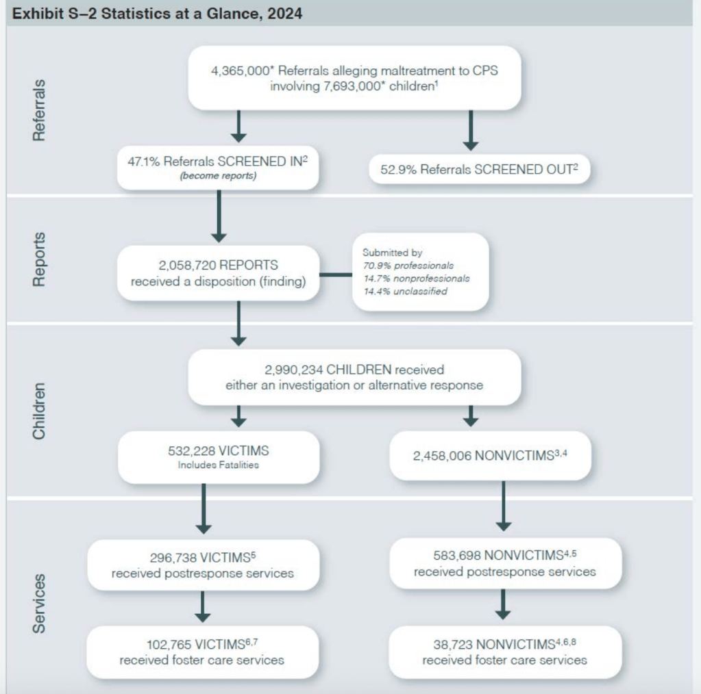 The annual Child Maltreatment reports, produced by the Children’s Bureau of the US Department of Health and Human Services, are based on data that states submit to the National Child Abuse and Neglect (NCANDS) data system. The new report, Child Maltreatment 2024 (CM2024), provides data for Federal Fiscal Year (FFY) 2024, which ended on September 30, 2025. Exhibit S-2 summarizes the findings of the newest report. Child welfare systems operate somewhat like a funnel, at each stage selecting a fraction of the cases or children to proceed to the next stage.. Child welfare agencies received 4.365 million “referrals” alleging maltreatment and “screened in” 47.1 percent of them as “reports,” of which 2,058,720 reports received an investigation or alternative response. The investigations resulted in a total of 532,228 children determined to be victims of child abuse and neglect.1