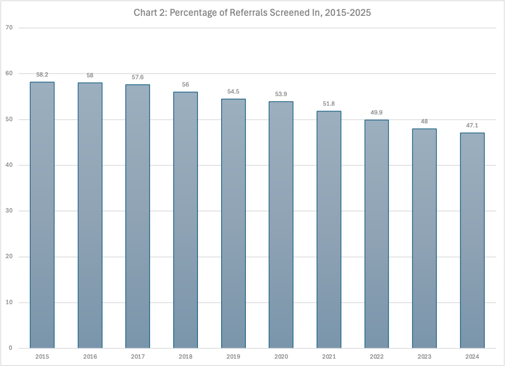 The Children’s Bureau, as it does every year, choses to show screened-in referrals divided by the child population, calling the result the National Screened-In Referrals Rate. This is an ambiguous indicator that reflects both the number of referrals and the proportion of those that are screened in. It is more useful to look at the percentage of referrals that an agency decides to screen in, which is an indicator of its willingness to intervene with families to protect children. Unfortunately, the the lack of screened-out numbers from some states makes this number an estimate because the total number of referrals in those states is unknown.6 Nevertheless, a clear pattern emerges when the percentage of referrals that were screened in between 2015 and 2024 is plotted in Chart 2. That percentage has decreased every year since 2015, especially after 2017, with the decline continuing during and after the pandemic. Between 2017 and 2024, the percentage of referrals that were screened in dropped from 57.6 to 47.1.