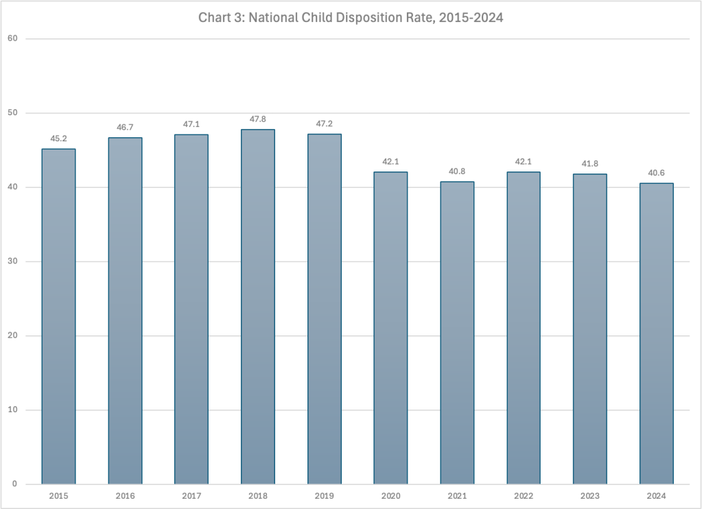 The National Child Disposition Rate rose from 2015 to 2019, falling drastically with the pandemic in 2020 and again 2021. In 2022 it was back to the 2020 level of 40.1 per 1,000 children, but then began declining. The pandemic may have masked what would have been an annual decline in this rate every year between 2018 and 2024. The proportion of children touched by CPS has dropped significantly since its high of 47.8 per 1,000 in 2018 to 40.6 in 2024. Given the lack of a decrease in referrals during that time period except for the very small decrease in 2024, this pattern must reflect the drop in the proportion of reports that were screened in over the period.