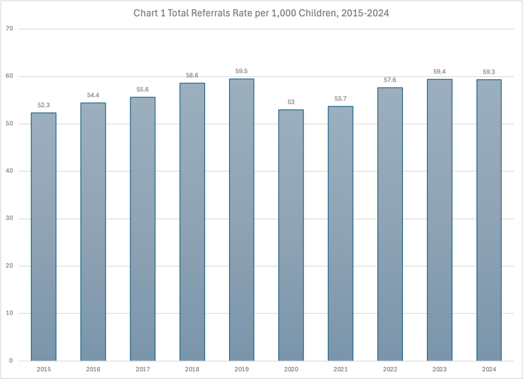 The very small decrease in the referral rate between 2023 and 2024 could have been caused by changes in policy, practice, and the types of messaging coming fom child welfare agencies, state officials and advocates around mandatory reporting of child abuse and neglect. State legislators, agency heads and advocates have recently worked to discourage calls to their child abuse hotlines based on the prevailing belief that many of these calls do not concern maltreatment but rather poverty and are often influenced by bias against parents of color. Agencies have been revising their mandatory reporter training4 to discourage reporting of concerns that are allegedly about poverty rather than child abuse or neglect. Implicit bias training is often included based on the belief that mandatory reporters are influenced by racial, cultural and class bias. In some states, “warmlines” are being set up to accept calls that are allegedly related to poverty rather than child maltreatment.5 Some states have banned anonymous reports to child abuse hotlines on the grounds that such reports are frivolous and expose children and families to unnecessary trauma–an assertion that has been challenged by based on research showing that anonymous reports save children’s lives. Such bans passed by the legislatures in Texas and Arkansas took effect shortly before the beginning of FFY 2024. In Texas, the number of referrals fell from 249,283 in 2023 to 233,112 in 2024. In Arkansas, it fell from 63,732 to 57,371. (A ban on anonymous reporting has been signed by the Governor of New York State and will take effect next summer; we may see its effect in the following fiscal year.)