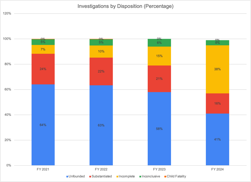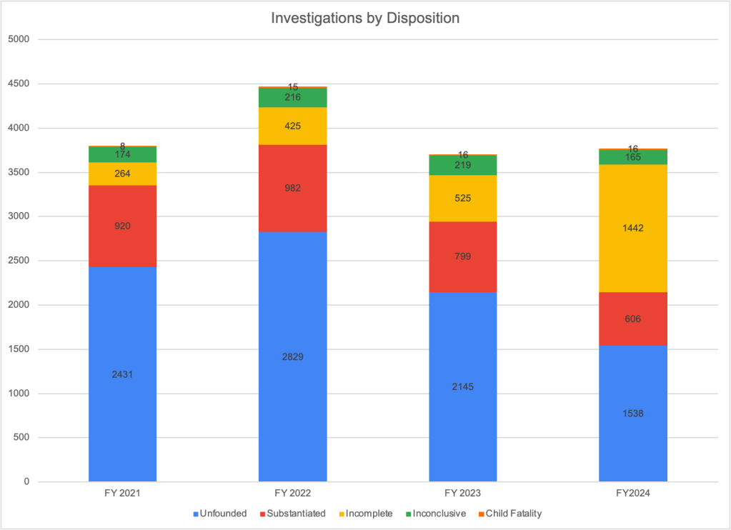 There was a big jump in the number of investigations categorized as incomplete, from 525 in FY2023 to 1,442 in FY2024. That was an increase from 15% of all investigations to 38% of all investigations. As a consequence of the increase in incomplete investigations, the number and percentage of investigations that were unfounded and substantiated dropped drastically. The number of investigations that were substantiated fell from 799 (21 percent of investigations) in FY2023 to 606 (or 16 percent of investigations) in FY2024. Unfounded remained the most common disposition in FY2024, but the proportion of cases that were unfounded dropped from 58 percent to 41 percent.