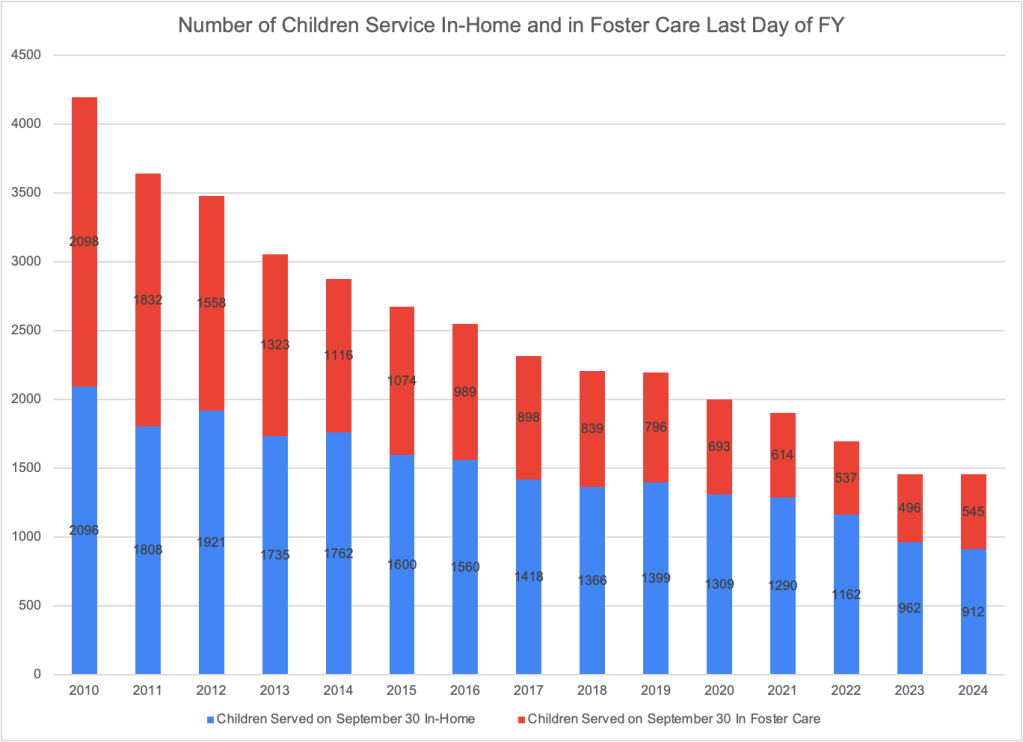 The table below shows the number of in-home case openings and children entering foster care by year. These two numbers cannot be added together because because in-home entries are reported at the case level (with multiple children in many cases) and foster care entries are reported at the child level. However the trends over time can be compared, showing that the number of in-home cases opened dropped between FY2023 and FY2024 while the number of children entering foster care increased. This was the first time the number of children entering foster care increased since FY2021, after the drop in foster care placement due to COVID-19.\