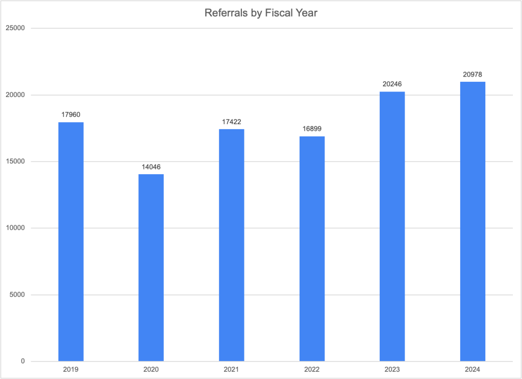 Total referrals (or calls to the CFSA hotline) have increased for the second year in a row. After falling in 2020 and remaining below 2019 levels in 2021 and 2022, the number of referrals jumped from 16,899 in FY2022 to 20,246 in FY2023 and then rose more modestly to 20,978 in 2024โan increase of 3.6 percent. Prominent child welfare scholars like Emily Putnam-Hornstein have concluded that referrals are the best available indicator of actual maltreatment due to the strong correlation between referrals and future reports (regardless of the outcome of any associated investigation) and also evidence of the difficulty of correctly determining whether maltreatment has occurred. Thus, the increase in referrals may well be a sign of increasing maltreatment. Contributing factors might be the end of COVID-19 assistance programs and the growing mental health, substance abuse, and housing crises in the District.