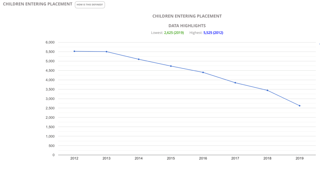 - These totals are lower than the sum of the children with foster care entries and in-home case openings, presumably because some children entered in-home services and were placed in foster care in the same year. ↩︎